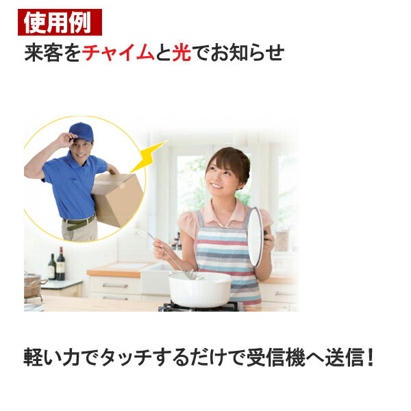 ・送信機の電池切れが受信機でもわかる、電池切れお知らせ機能付き ・軽い力でタッチするだけで受信機へ送信! ・電波は256通りのIDコードで混信しにくくなっています。