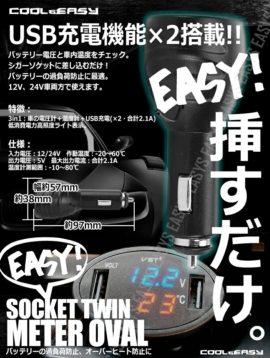 USB 2口 合計2.1A シガー 充電器 バッテリー 電圧計 温度計 12V 24V スマホ タブレット 高速 急速 充電 3in1 ソケット ツイン メーター オーバル