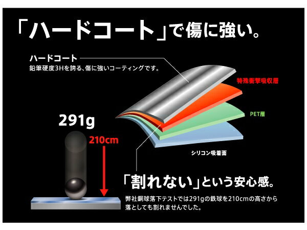 弊社鋼球落下テストでは291gの鉄球を210cmの高さから落としても割れませんでした。